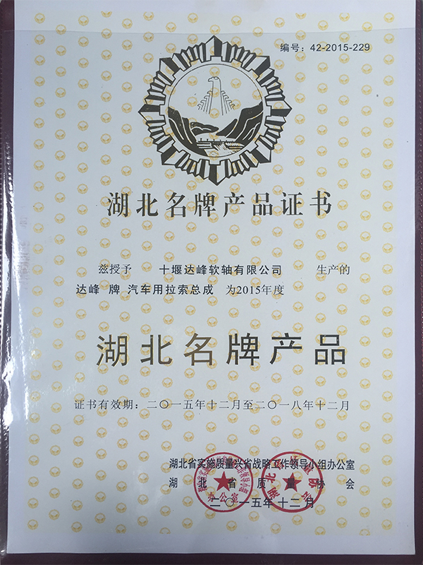 湖北名牌產(chǎn)品證書2015年