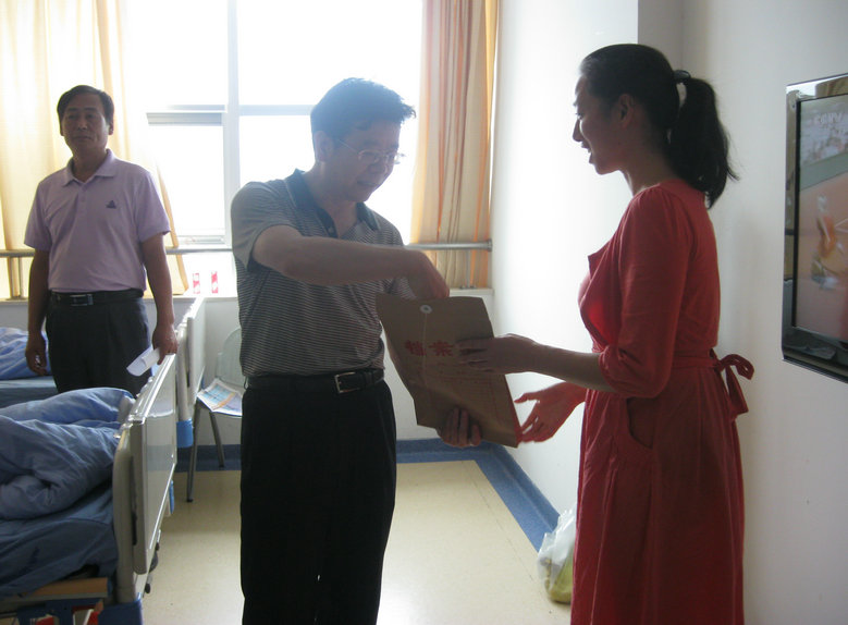 公司工會主席李應濤到醫(yī)院看望病人并將愛心捐款如數(shù)交給患者家屬