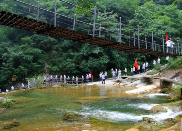7點(diǎn)的清晨,濕潤(rùn)的空氣中夾雜著些許細(xì)雨,柔柔的飄落在臉上,瑩瑩的泛著光華。公司辦的工作人員們臉上掛著喜悅,忙碌的準(zhǔn)備各項(xiàng)工作,發(fā)放著水和食物。一百多名黨員依序上了兩臺(tái)大巴車(chē),揮舞著鮮亮的黨旗,我們起程了!隨著1個(gè)多小時(shí)的驅(qū)車(chē)行程,我們來(lái)到了虎嘯灘。虎嘯灘位于鄖縣大柳鄉(xiāng)轄區(qū)。這里曾經(jīng)產(chǎn)生了鄖縣第一個(gè)地下黨組織,并成為解放鄖陽(yáng)地區(qū)的前沿陣地?;[灘的河水在流失的歲月中、在堅(jiān)硬的石壁上洗出這條河,深有丈余。“歲月千古,逝者如斯。”不經(jīng)意,你會(huì)追憶起那些在歷史的星河中,消逝的革命先烈們。走在這里,年輕的正奧黨員們似乎都感受到了水滴石穿的深刻哲理和鍥而不舍的革命精神,同時(shí)也領(lǐng)略到了革命老區(qū)的魅力所在。深林奇石間、索橋水澗旁,正奧公司的100多名黨員干部們揮動(dòng)著鮮紅的黨旗,猶如一條巨龍游行其間。悠悠山谷中不時(shí)回蕩出幾首紅歌。大家并肩攜手,空氣是溫潤(rùn)的。今天這片山林中,個(gè)中滋味,好不自在!